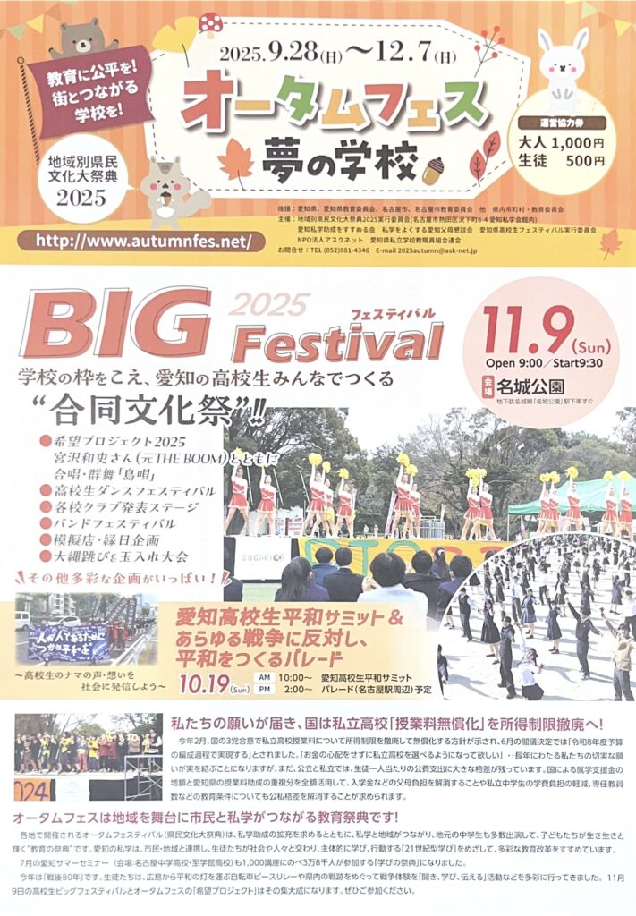 今年は「戦後80年」です。生徒たちは、広島から平和の灯を運ぶ自転車ピースリレーや県内の戦跡をめぐって戦争体験を「聞き、学び、伝える」活動などを多彩に行ってきました。11月9日の高校生ビッグフェスティバルとオータムフェスの「希望プロジェクト」はその集大成になり、各地域の特色を活かした市民参加型の講座や講演など、盛りだくさんの内容でお届けします。